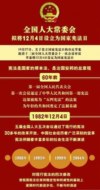 2014年10月,党的十八届四中全会通过了《中共中央关于全面推进依法治国若干重大问题的决定(讨论稿)》于2014年11月1日十二届全国人大常委会第十一次会议表决通过,成功将12月4日设立为国家宪法日。[1]。